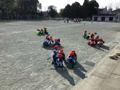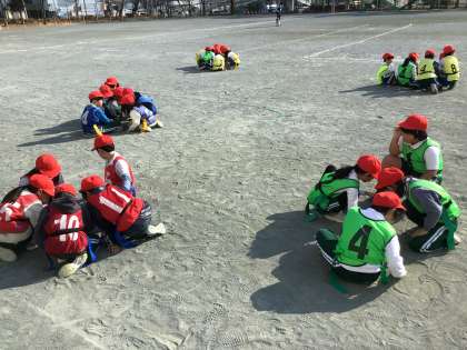 タグラグビーの作戦タイムの様子です。どうやってゴールに辿り着くか、一生懸命アイデアを出し、話し合っています。
