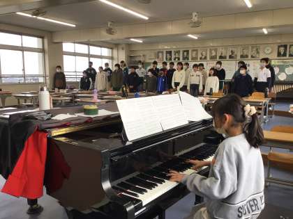 6年生の音楽科の授業の様子です。歌詞にある情景を想像したり強弱に気をつけたりしながら歌の練習をしています。次は表情も意識して歌えるように頑張ります。