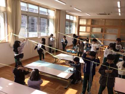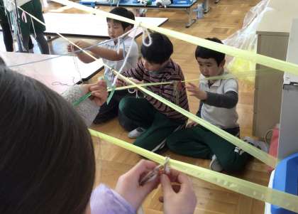 図画工作科「ひもでつないで」の学習の様子です。ひもをつないでできる形や色、場所の感じなどの面白さについて感じ取りながら、楽しそうに活動していました。
