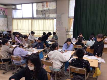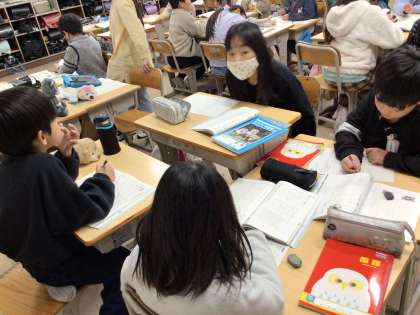 「道具のうつりかわりを説明しよう」の学習の様子です。道具のうつりかわりについてグループで協力しながら調べています。