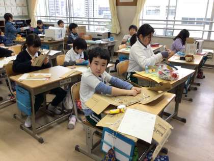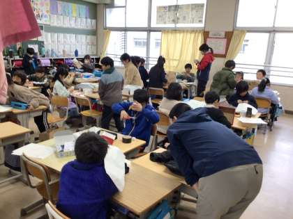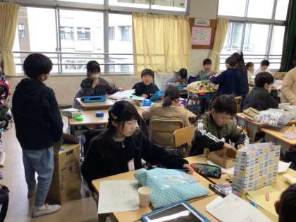 磁石や電気、ゴムなど、3年生で学習した理科の知識や技能を生かして、おもちゃを作っています。