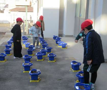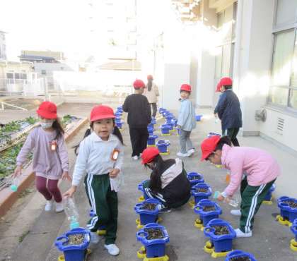 1年生が育てているチューリップの芽が出てきました。「最初は、さつまいもの色だったけど、緑になってきたよ」と出てきた芽の色の変化を教えてくれました。継続して観察していくことで、細かな変化にも気づき、楽しんでいるようです。