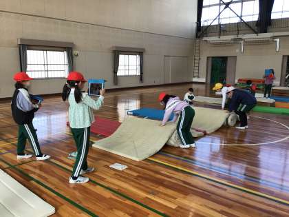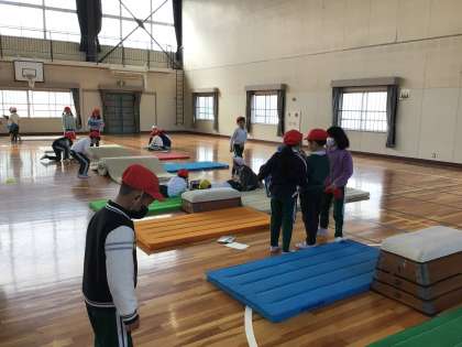 とびばこの練習の様子です。グループで動画を撮り、見返すことで、技の精度を上げています。