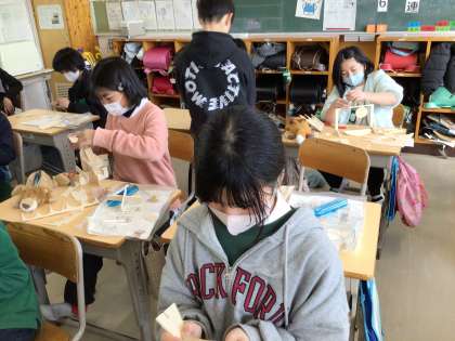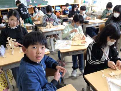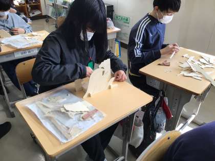 電動糸のこぎりで切ったパーツを組み立てました。思い思いの形にできあがってきました。
