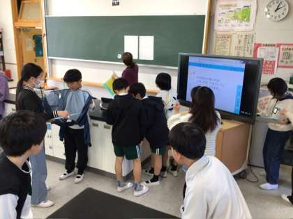 理科の学習の様子です。学年のまとめをクイズ形式にして班で答えていました。ペアで確認しながら、楽しんで回答をしていました。