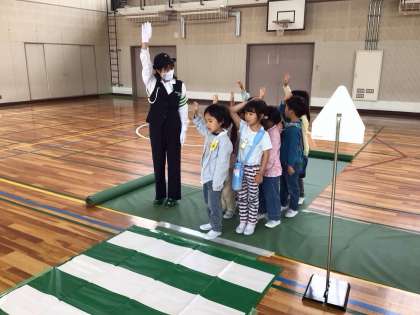 交通安全指導員の方々に教えていただきながら「右、左、右、車よし。」と声を出して、安全に横断歩道を渡る練習をしました。交通安全の意識が一層高まりました。
