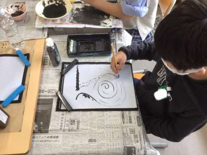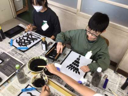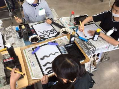 習字セットを用意して書写の時間…ではなく、図工の時間です。「墨と水から広がる世界」の授業で、水の量を調節して、濃淡を味わいながら試しがきをしました。次回は作品に仕上げていきます。
