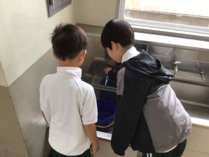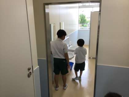 1年生に正しい掃除のやり方を教えたり、重い物を運ぶ手伝いをしたりしています。縦割り掃除に向けて、きちんと掃除ができる集団を目指してがんばっています。