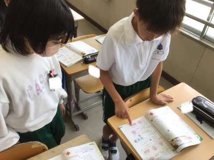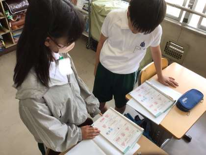 文字を使った式が、図のどの部分を求めているのかを、隣の席の友達に説明しています。