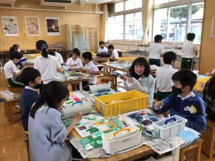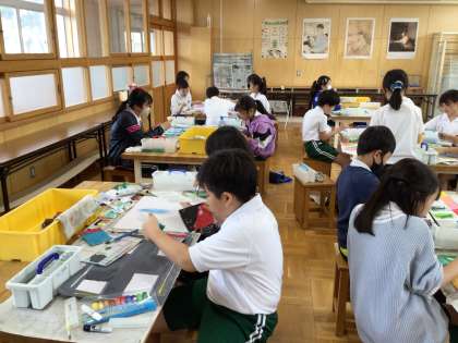 「心のもよう」の学習の様子です。気持ちカードを貼って色をつけ、自分の心を表現しています。もうすぐ完成です。