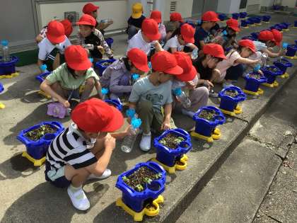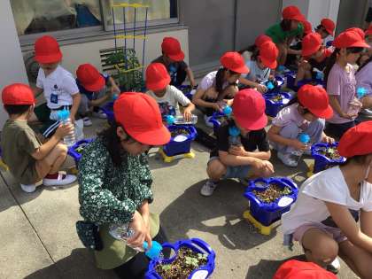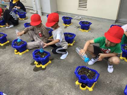 先週の水曜日にまいたアサガオの種から芽が出ました。朝の支度を終えた子どもたちが、嬉しそうに水やりをしています。