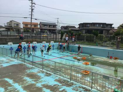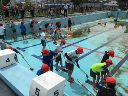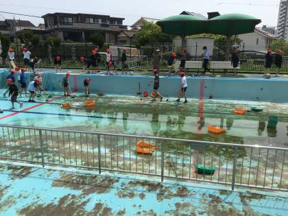 全校児童を代表して、6年生がプールを掃除しています。少しずつ、底がきれいになってきました。