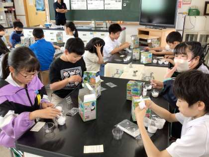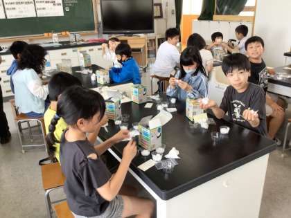 植物の発芽条件を調べる実験の準備をしています。うまく発芽するように、丁寧に種を入れています。