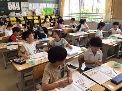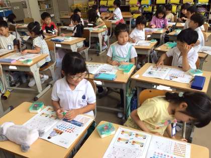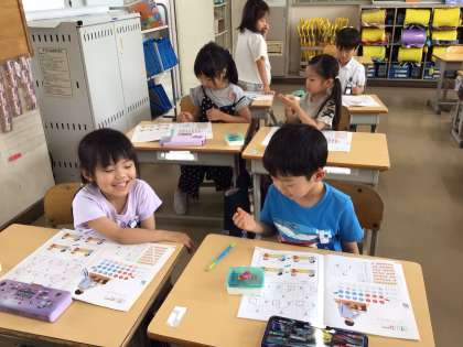 1年生の算数科「いくつといくつ」の授業の様子です。2人でサイコロを振って、出た目の数からいくつといくつで7が作れるかを考えながらゲームをしています。2つの数で7が作れたときは嬉しそうにガッツポーズをし、楽しみながら学びました。