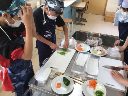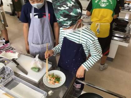 いためる料理の学習で調理実習を行いました。香ばしい香りがしてきました。