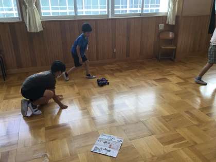 電池のはたらきの学習で学んだことを活かし、動く車をつくりました。電流の向きと強さを考えるのがポイントです。