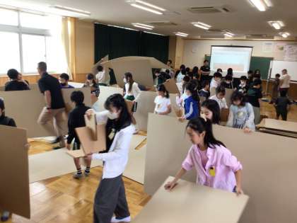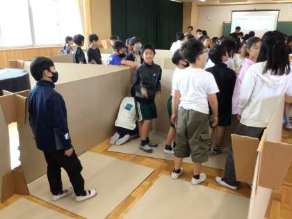 災害時用のトイレの設置方法を見たり、ダンボールで間仕切りを作ったりしました。