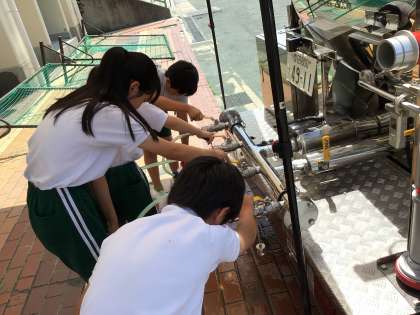 非常時に給水車から水をもらい、運ぶことを想定した体験をしました。給水袋には約6lもの水が入り、それを運ぶにはかなりの労力がいることを身をもって感じました。