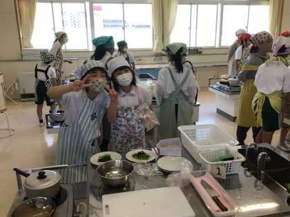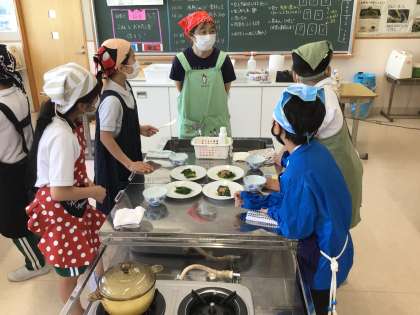 調理実習の様子です。今回はご飯を炊く、青菜を茹でるという調理をしました。お手伝いいただいたサポーターの皆さん、ありがとうございました。