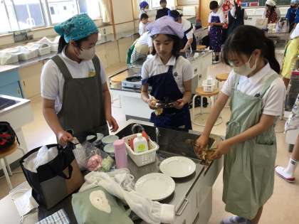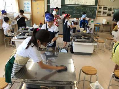 調理実習の様子です。食べ終わったらお皿洗いや片付け、掃除まで丁寧に行います。