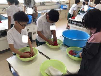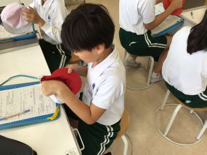 洗濯実習を行いました。普段使っている赤白帽子の汚れや臭いを確かめてから、手洗いで洗濯しました。
