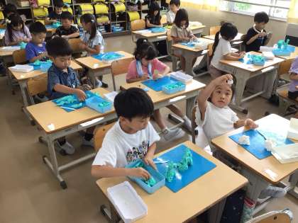 図工「いっしょにおさんぽ」の学習です。粘土の「ひねり出し」の技を使って、「自分」と「一緒にお散歩したい仲間」を作っています。