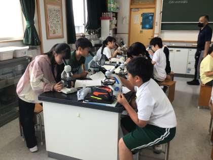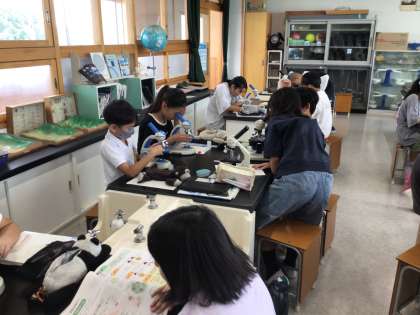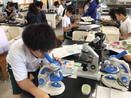 理科の学習の様子です。アサガオとサツマイモの花粉を観察しました。