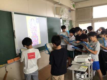 豊田市美術館の学芸員の方をお招きして、グスタフ・クリムトの「オイゲニア・プリマフェージの肖像」を鑑賞し、感じたことを発表したり、友だちの考えを聞いたりしました。