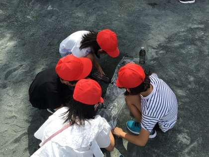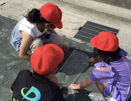 理科で、水が流れる様子を観察しました。先日の大雨の日に見た、雨水が流れたり水たまりになっていた様子を思い出して、場所を選んでいます。