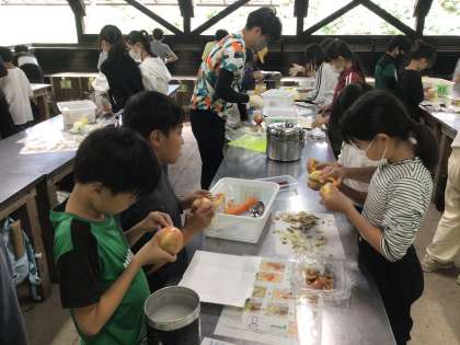 慣れない手つきで、米を研いだり、野菜を切ったりしました。、仲間と協力してカレー作りを頑張っています。