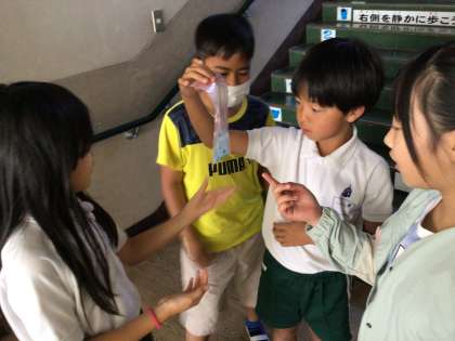 『水蒸気は空気のどこにでもふくまれているのか』という問題を解決するための実験をしました。保冷剤を入れた袋を数分おいた後、袋の周りについた水に驚いていました。