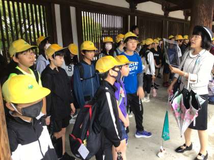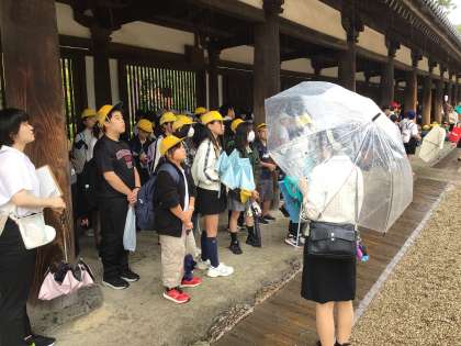 法隆寺の見学を学級ごとにしました。雨の中の見学になりましたが、世界最古の木造建築を間近に見ることができました。