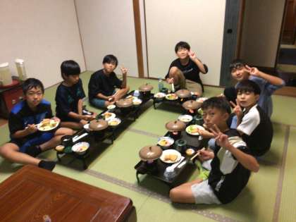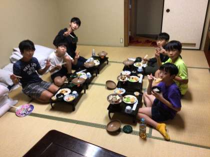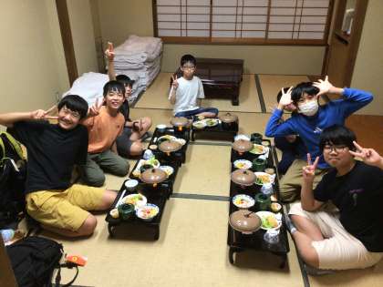 部屋ごとに夕食を食べました。いっぱい歩いたのでお腹もぺこぺこで、たくさん食べることができました。