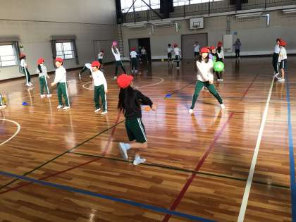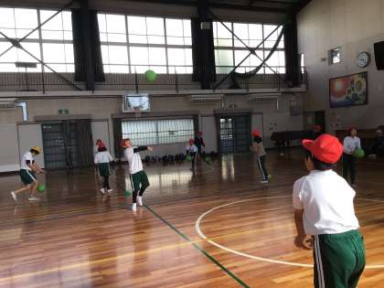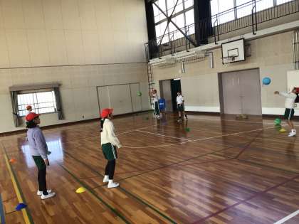 「ソフトバレーボール」がはじまりました。今日は、2種類のパスの仕方を知り、相手が取りやすいパスを返す練習をしました。