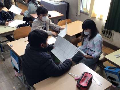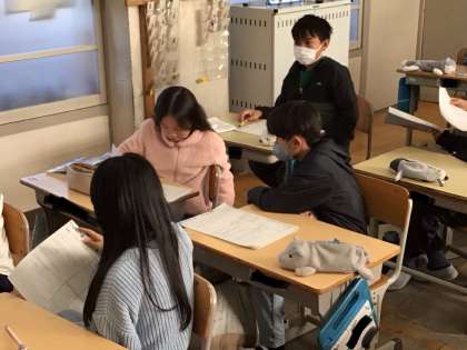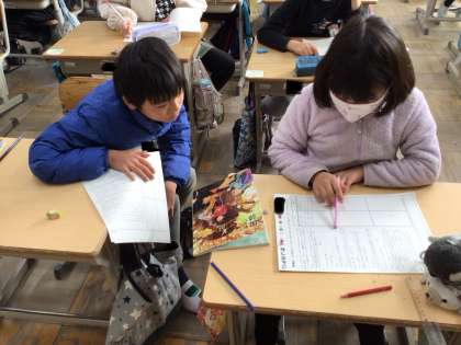 「ごんぎつね」で、文章からごんと兵十の思いを読み取ったことを、友達と伝え合っています。ごんの思いの変化がわかってきました。