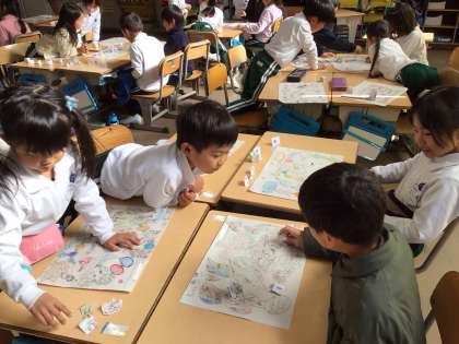 1年生の図画工作科「わくわくおはなしすごろく」の授業の様子です。自分たちで作ったおはなしすごろくが完成し、みんなで遊びました。