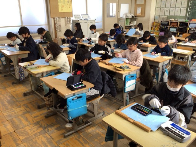 版画「生き物いきいき」で、板を彫っている様子です。安全に気をつけながら、白黒になる様子を思い浮かべて彫っています。