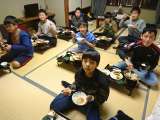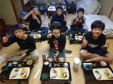 夕飯を食べています。たくさん活動したので、お箸が進みます。あとは、お風呂に入って...