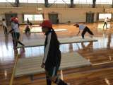 マット運動で、連続技の組み立てを考えて練習をしているところです。
