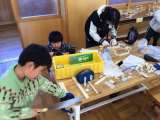 のこぎりで木を切るのも、だいぶ慣れてきたようです。 切れた木材を組み合わせて作品...