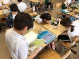休み時間の図書館です。委員会活動としての本の貸し出しも始まり、たくさんの子が本...