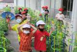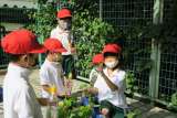 アサガオのつるが子どもたちの身長を超え、花も咲き始めています。「早く咲いてくれな...