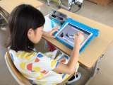 図工の学習でタブレットを活用し、自分のお気に入りの場所に小さくなった自分を入れた...