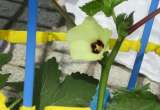 生活科で育てているオクラの花を指さしながら「きれいな花だよ」とうれししそうに声...