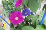 生活科で育てているアサガオに花が咲き始めました。友達の花の色と比べたり、数を数...