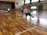 体育館で、ジャンプの運動に取り組んでいます。「けんけんぱ」で跳ぶ、両足で跳ぶ、...