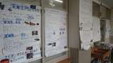 教室の廊下側にたくさんのB紙(模造紙)が掲示してあります。児童が夏休みに取り組ん...