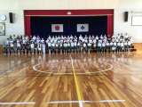 体育館で学習発表会の練習をしました。 当日の並び方に合わせて座りました。 ご家庭...