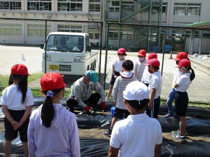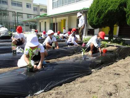 5月10日、1・2年生が夏野菜の苗を植えました。地域の方の指導のもと、それぞれ家から持ってきた苗を一生懸命に植えていました。早く終わった2年生が、優しく1年生に教えている姿もすてきでした。