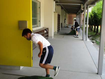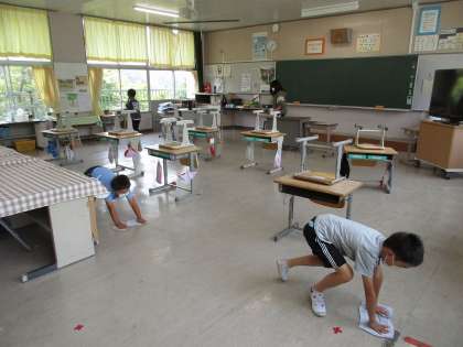 6月9日、掃除の様子です。本校はたて割り(なかよし班)掃除を行っています。本校の少人数を生かして密を避けつつ、高学年と低学年が組になって行っています。なかよし班で、子どもたちがいつもと違う場所で輝くよさを生かしながら、感染対策も意識しつつ続けています。誰もしゃべらず、それぞれの担当を真剣に行っています。